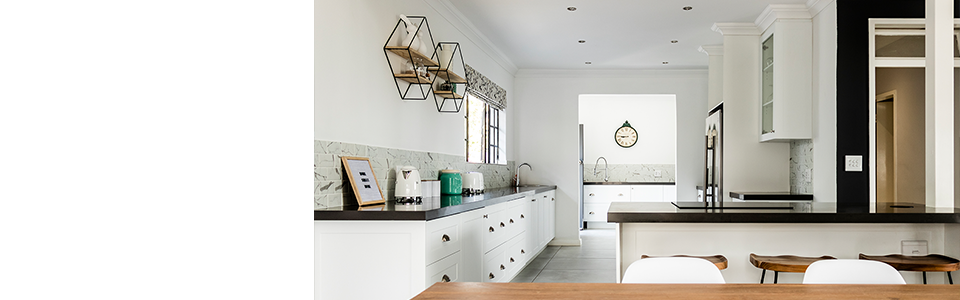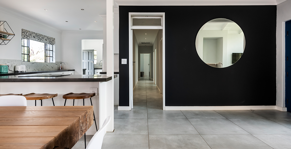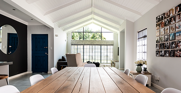 The challenge with this house in the South of Johannesburg was to create a stylish, contemporary space while preserving the original mid-century aesthetic of its 1970s design, merging the two into a single unique expression. The open plan kitchen and living area was the key – it now serves as the beating heart of the home, accentuated by the striking large window. The living room flows naturally to the outside entertainment area and swimming pool, cementing the elegant quality of this full renovation.